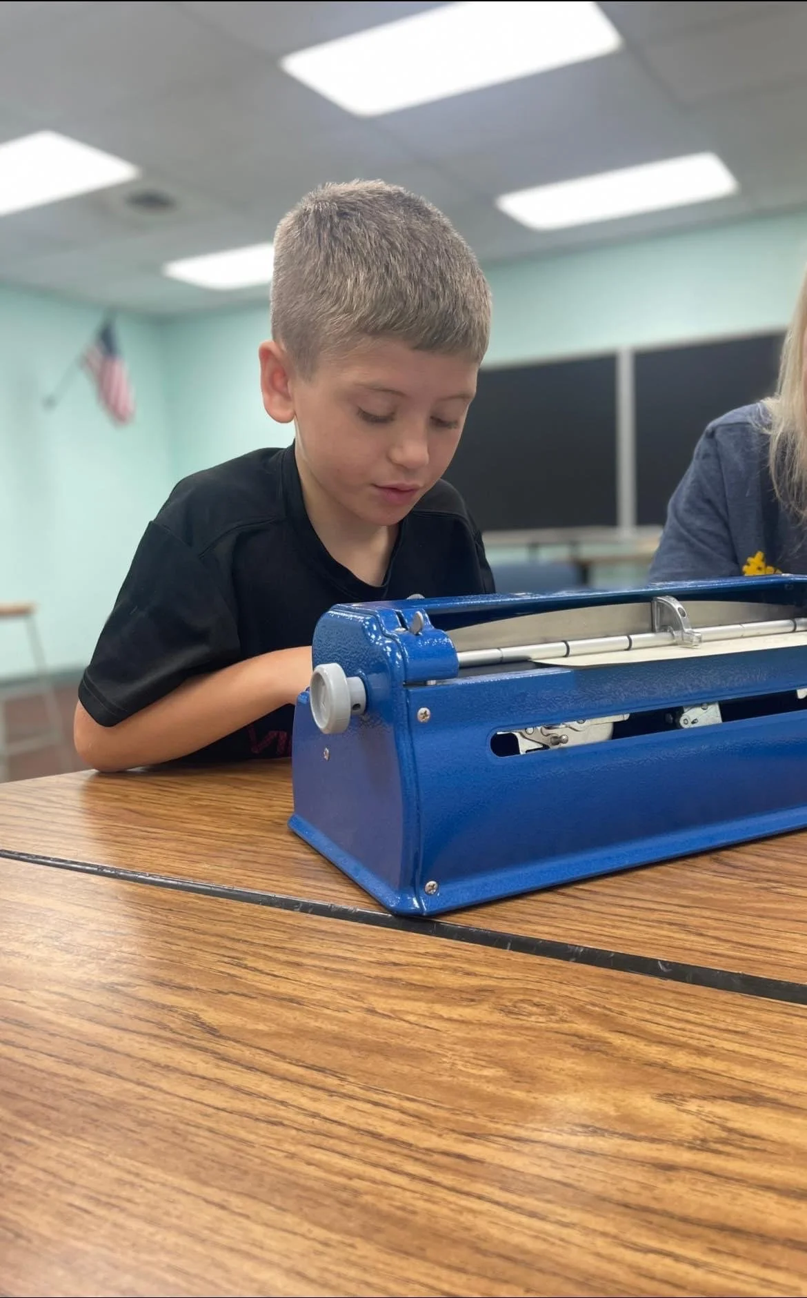Grayson practices his White Cane and Braille